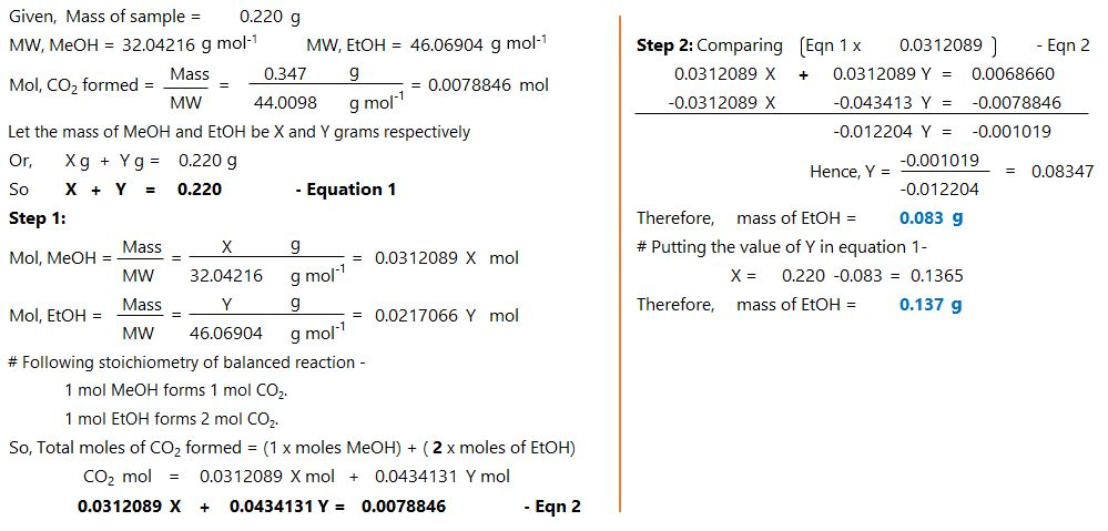 What is the mass of methyl alcohol (CH3OH) in the sample?