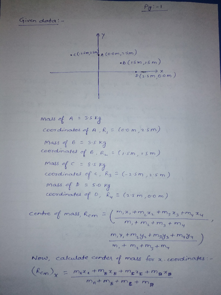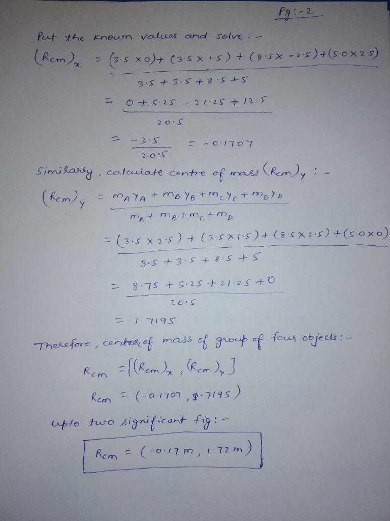 Consider an object with a mass of 3.5 kg located at R1 = (0.0 m, 2.5 m), another object with a mass of 3.5 kg located at R2 = (1.5 m, 1.5 m), and a third object with a mass of 8.5 kg located at R3 = (– 2.5 m, 2.5 m), and a fourth object with a mass of 5.0 kg located at R4 = (2.5 m, 0.0 m). Calculate the center of mass of this group of four objects. Give your answer in the form Rcm = (xcm, ycm) and with 2 significant figures.