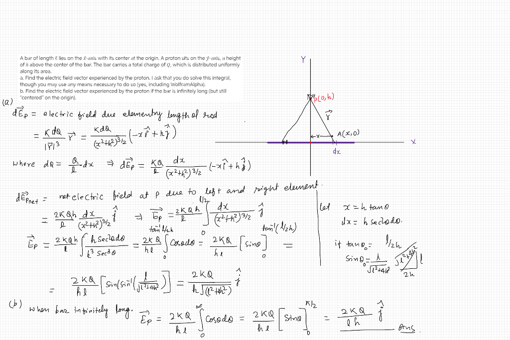 b. Find the electric field vector experienced by the proton if the bar is infinitely long (but still “centered” on the origin).
