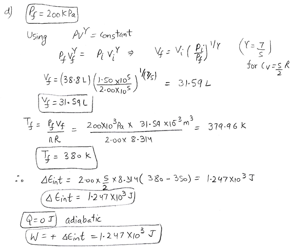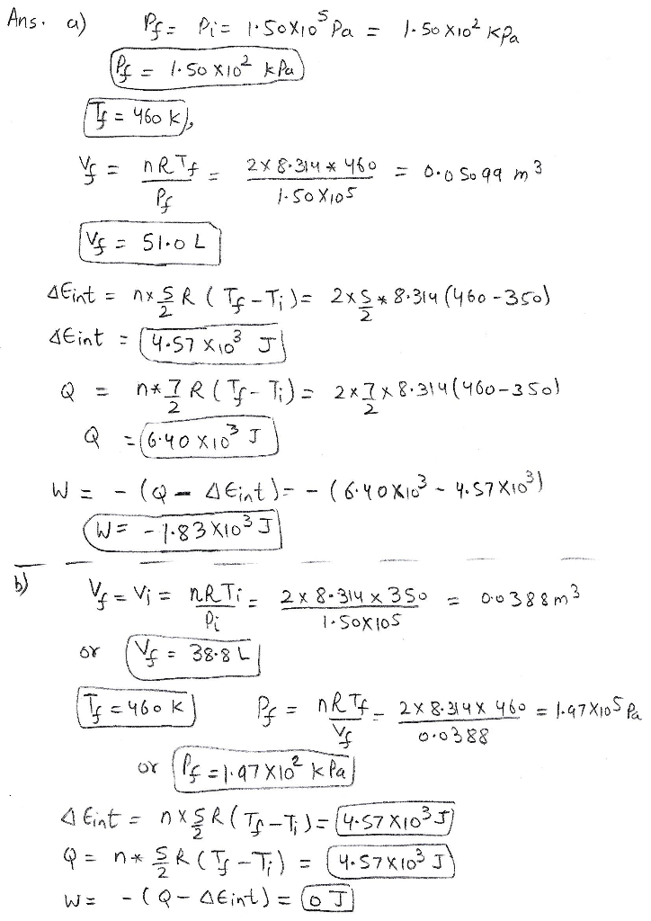 A 2.00 mol sample of an ideal gas with a molar specific heat of CV = 5/2 R always starts at pressure 1.50 ✕ 10^5 Pa and temperature 350 K. For each of the following processes, determine the final pressure (Pf, in kPa), the final volume (Vf, in L), the final temperature (Tf, in K), the change in internal energy of the gas (ΔEint, in J), the energy added to the gas by heat (Q, in J), and the work done on the gas (W, in J) a.) The gas is heated at constant pressure to 460 K. b.) The gas is heated at constant volume to 460 K. c.) The gas is compressed at constant temperature to 200 kPa d.) The gas is compressed adiabatically to 200 kPa.