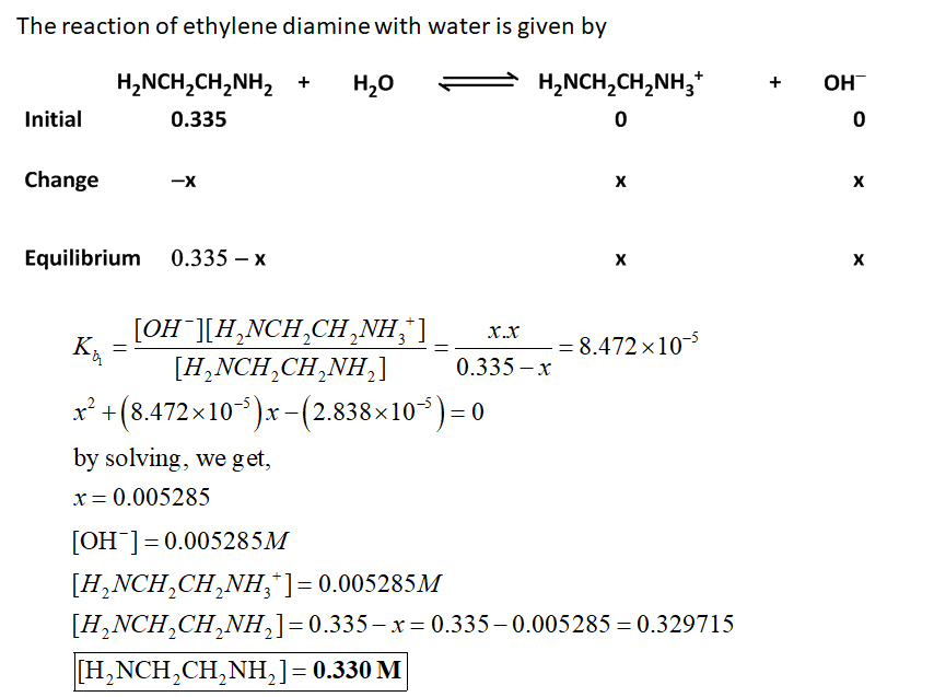 Calculate the pH of a 0.335 M solution of ethylenediamine (H2NCH2CH2NH2). The pKa values for the acidic form of ethylenediamine ( H3NCH2CH2NH3 ) are 6.848 (pKa1) and 9.928 (pKa2).