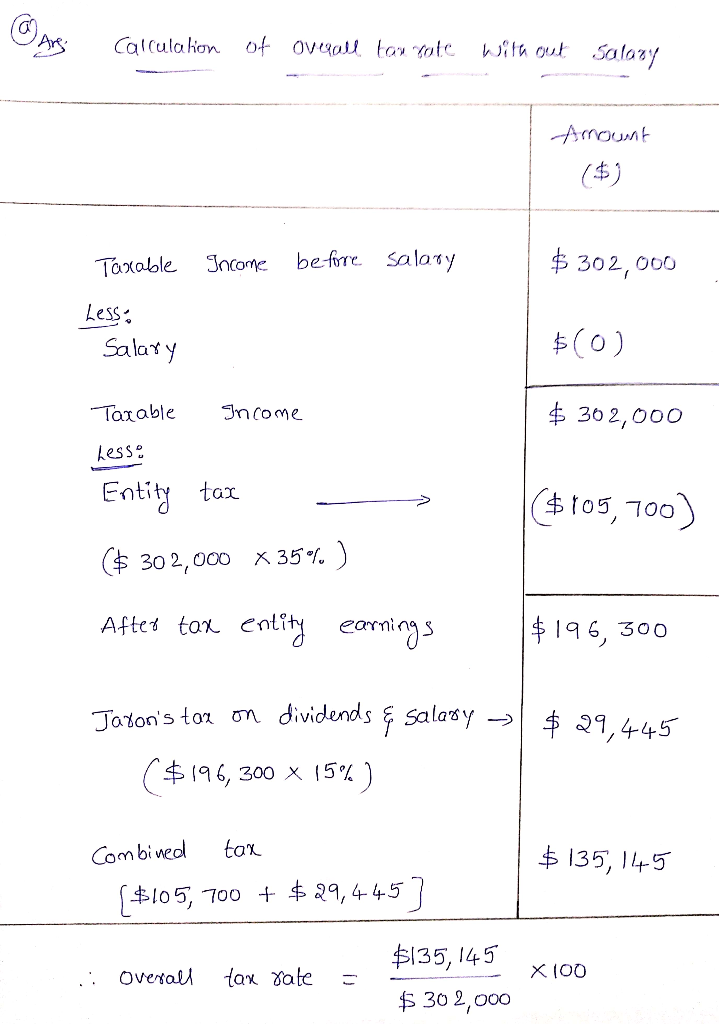 or the current year, Custom Craft Services Inc. (CCS), a C corporation, reports taxable income of $302,000 before paying salary to Jaron the sole shareholder. Jaron’s marginal tax rate on ordinary income is 35 percent and 15 percent on dividend income. Assume CCS’s tax rate is 35 percent. a. How much total income tax will Custom Craft Services and Jaron pay (combining both corporate and shareholder level taxes) on the $302,000 taxable income for the year if CCS doesn’t pay any salary to Jaron and instead distributes all of its after-tax income to Jaron as a dividend (assume Jaron is not subject to the net investment income tax or the additional Medicare tax)?