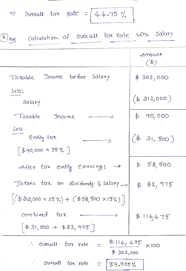 b. How much total income tax will Custom Craft Services and Jaron pay (combining both corporate and shareholder level taxes) on the $302,000 of income if CCS pays Jaron a salary of $212,000 and distributes its remaining after-tax earnings to Jaron as a dividend (assume Jaron is not subject to the net investment income tax or the additional Medicare tax)?
