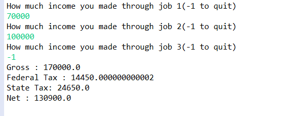 Write a java program that calculates the total amount of money a person has made over the last year. The program will prompt the user for dollar amounts showing how much the user has made per job. Some users will have had more than one job, make sure your program allows for this. The program will print out the total made (all jobs) and will print out the federal and state taxes based on the total made. For this program, the federal tax will be 8.5% and the state tax will be 14.5%.
