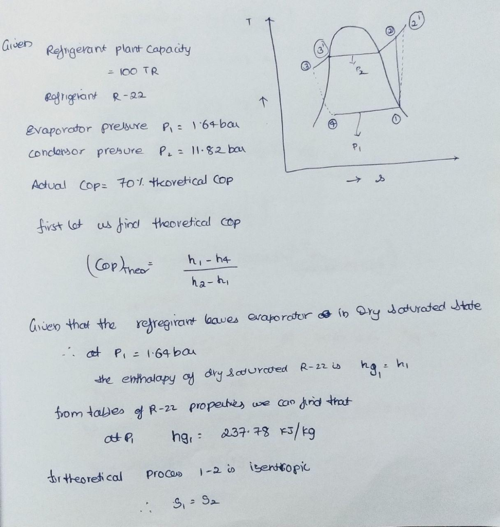 A refrigerant plant of 100 TR capacity uses R-22 as refrigerant. The condensing and