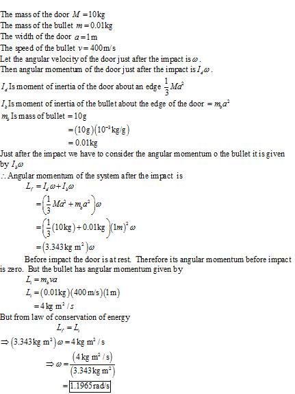 A 10 g bullet traveling at 400 m/s strikes a 10 kg, 1.0-m-wide doorat the edge opposite the hinge. The bullet embeds itself in thedoor, causing the door to swing open.