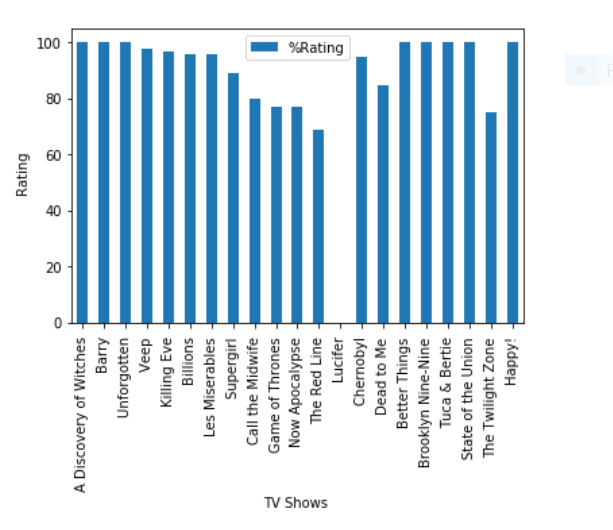 df = pd.DataFrame({'%Rating':rating}, index=tvshows)# first argument takes the number of bar plots(we require only one) and