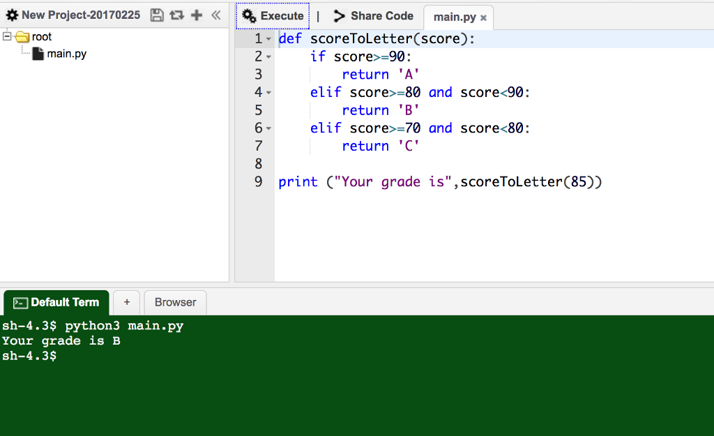 print ("Your grade is",scoreToLetter(85))
