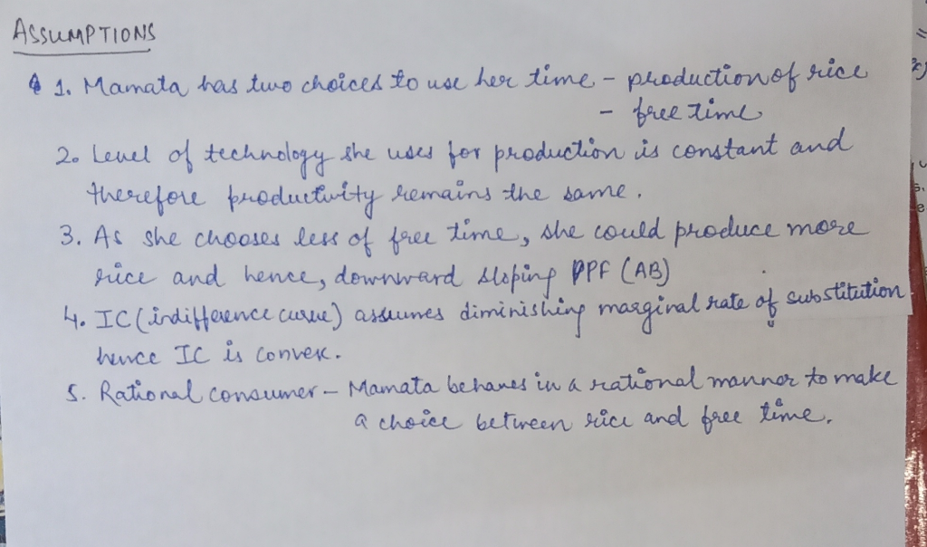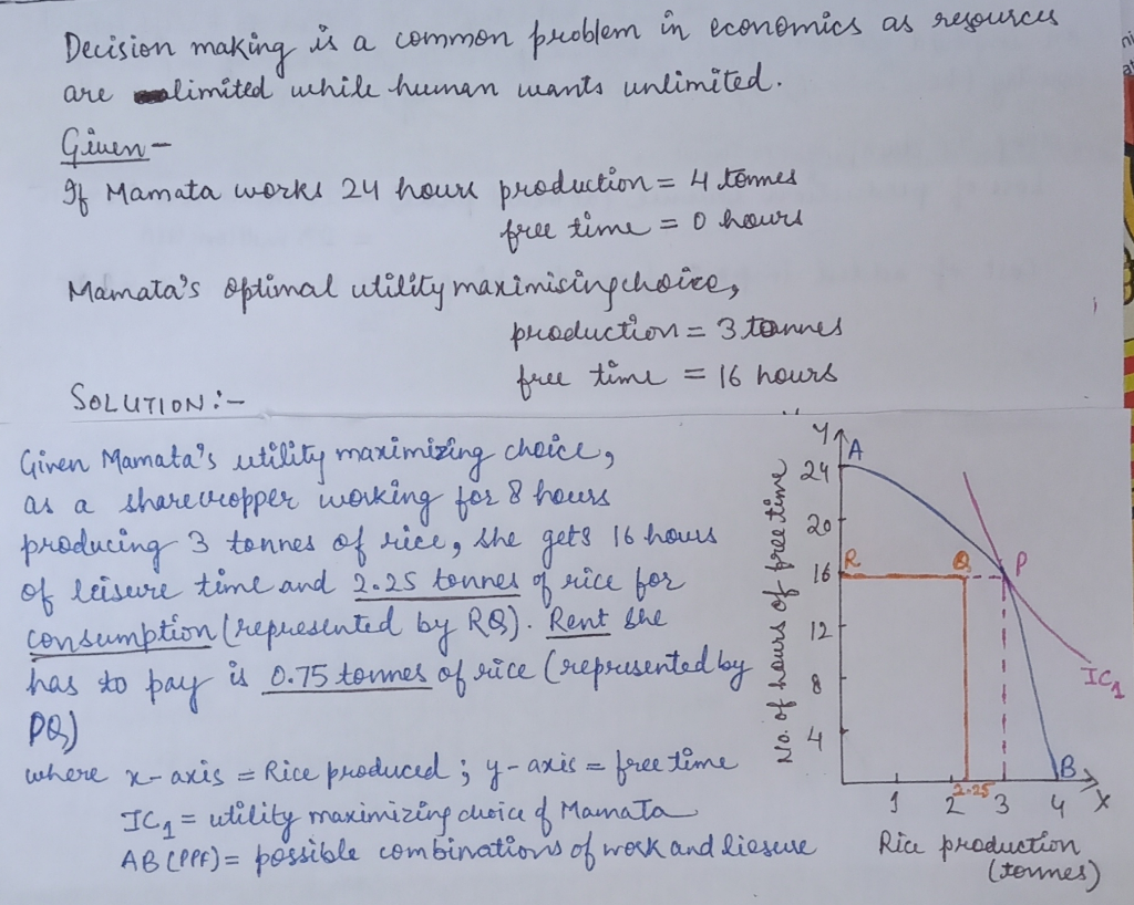 If Mamata was able to work 24 hours a day she could produce 4 tonnes of rice (the principal food crop cultivated in West Bengal) each day. You are told that Mamata’s utility maximising choice is to work for 8 hours and produce 3 tonnes of rice.