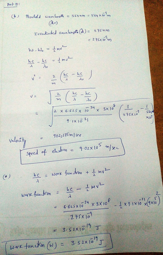 Part B. Photoelectric effect (a) What is the maximum number of electrons that can be emitted if a potassium surface is irradiated with light of wavelength 275 nm and absorbs 7.75 mJ, while the threshold wavelength for potassium metal is detected of 564 nm. (b) Find the speed of electrons ejected from this surface upon 275 nm radiation. (c) Express the work function of potassium in e