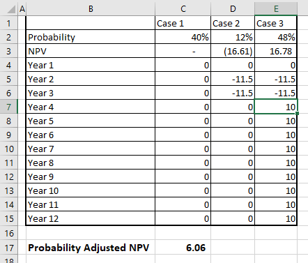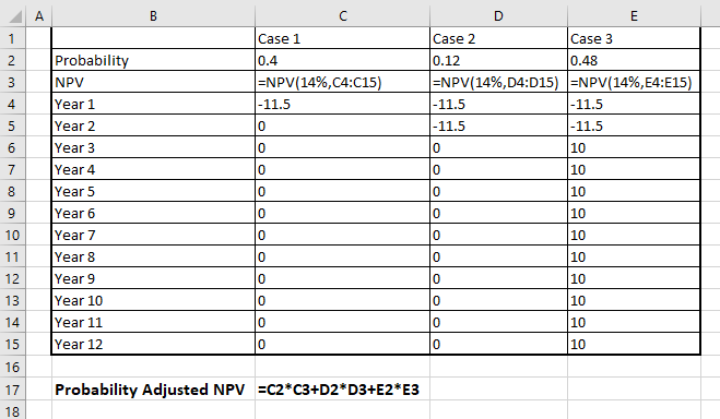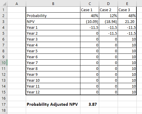 Probability adjusted NPV = Probability of case1*NPV of case1 +