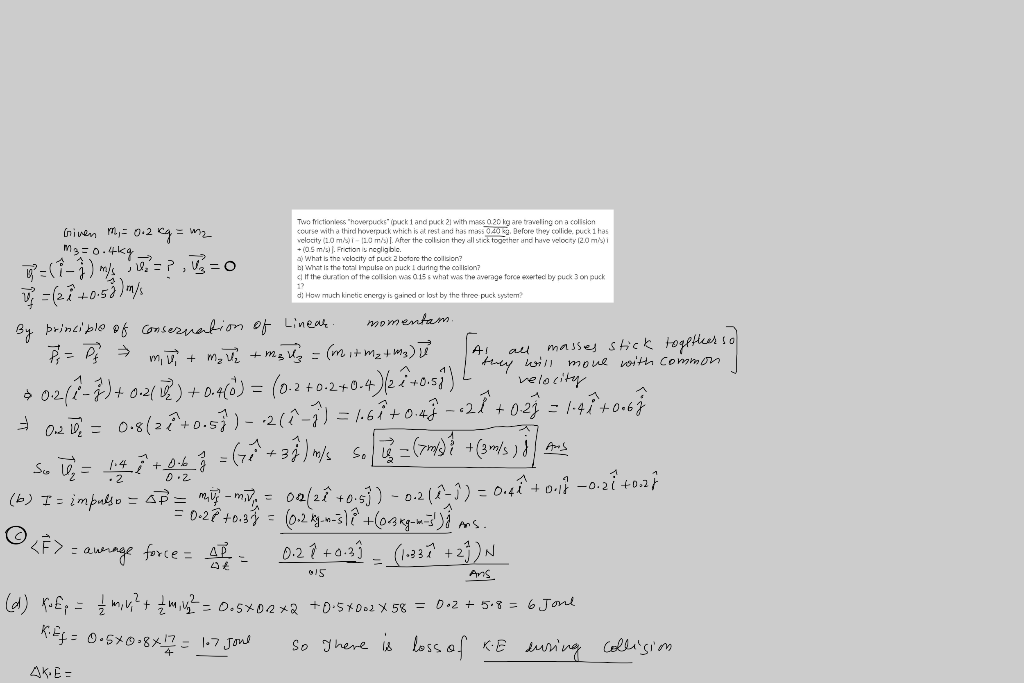 Two frictionless “hoverpucks” (puck 1 and puck 2) with mass 0.20 kg are travelling on a collision course with a third hoverpuck which is at rest and has mass 0.40 kg. Before they collide, puck 1 has velocity (1.0 m/s) î – (1.0 m/s) ĵ. After the collision they all stick together and have velocity (2.0 m/s) î + (0.5 m/s) ĵ. Friction is negligible.
