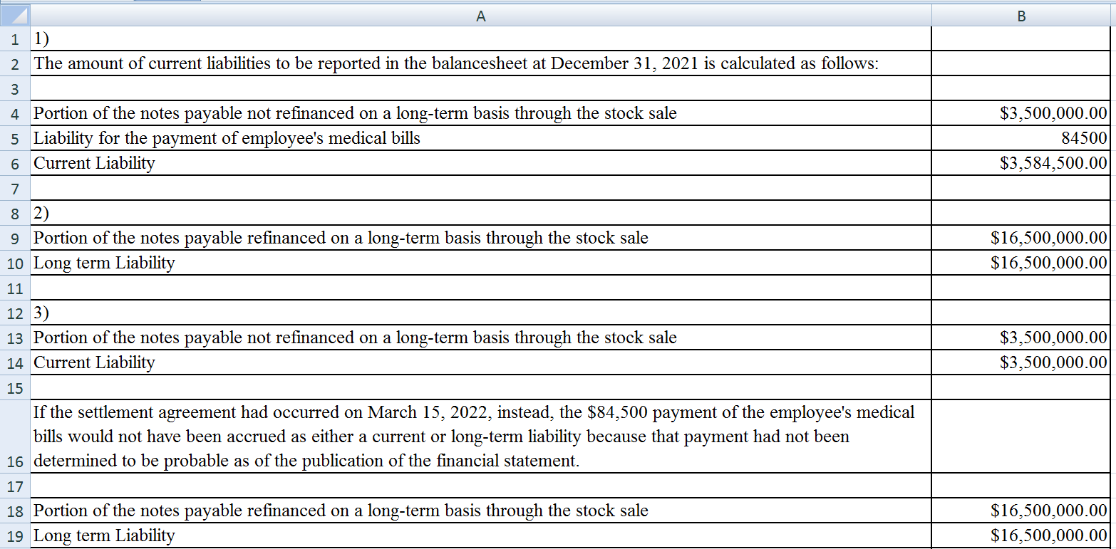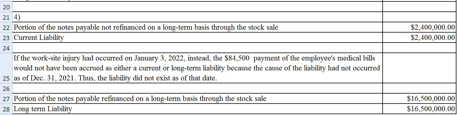 Van Rushing Hunting Goods’ fiscal year ends on December 31. At the end of the 2021 fiscal year, the company had notes payable of $20.0 million due on February 8, 2022. Rushing sold 5.5 million shares of its $0.25 par, common stock on February 3, 2022, for $16.5 million. The proceeds from that sale along with $3.5 million from the maturation of some 3-month CDs were used to pay the notes payable on February 8. Through his attorney, one of Rushing’s construction workers notified management on January 5, 2022, that he planned to sue the company for $1 million related to a work-site injury on December 20, 2021. As of December 31, 2021, management had been unaware of the injury, but reached an agreement on February 23, 2022, to settle the matter by paying the employee’s medical bills of $84,500. Rushing’s financial statements were finalized on March 3, 2022. Required:
