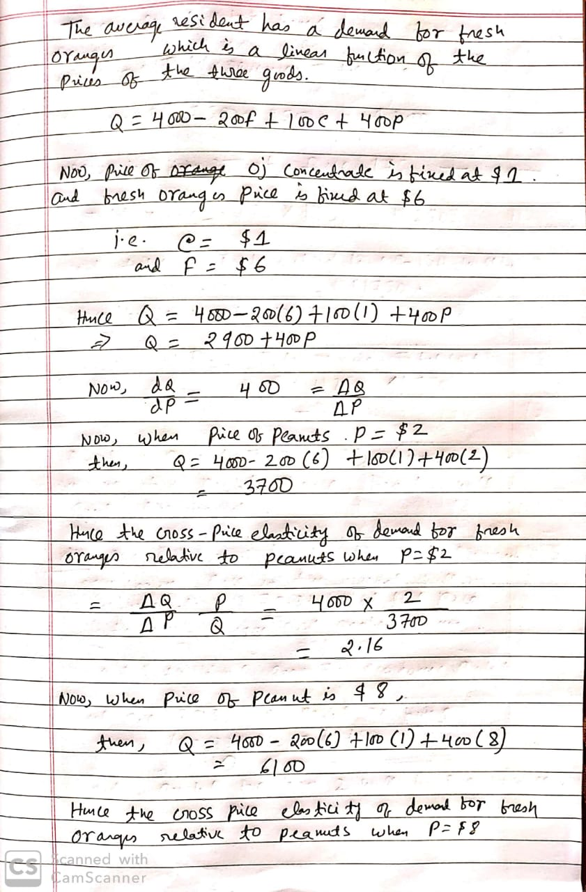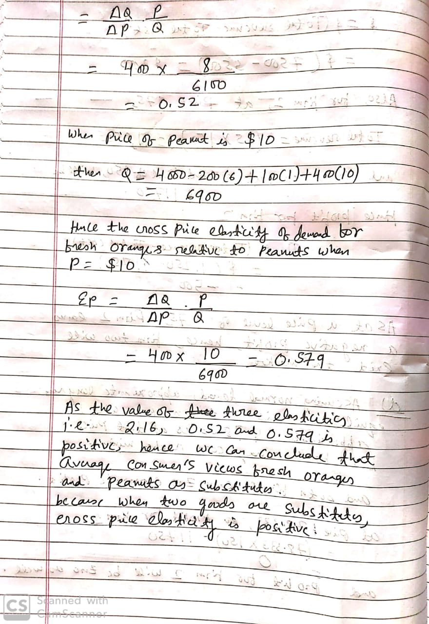 Question: Assuming the price of OJ concentrate is fixed at $1 and fresh oranges’ price is fixed at $6, find the cross-price elasticity of demand for fresh oranges relative to peanuts for the average consumer when the price of peanuts is at $2, $8, and $10. What does that tell you about how the average consumer’s views fresh oranges compared to peanuts?