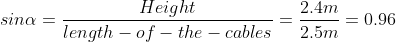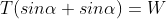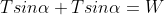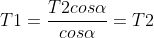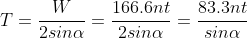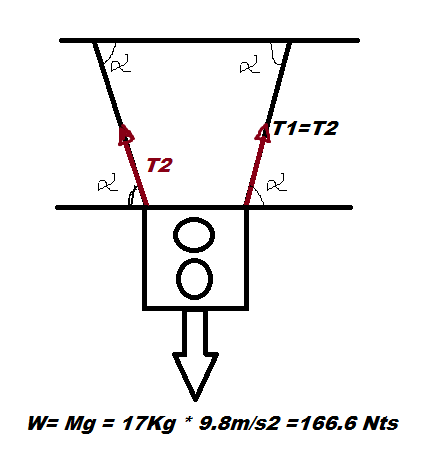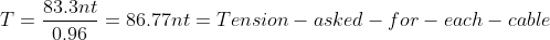 From where we can solve for T1 or T2 which we already proved that have the same magnituds, so we can wrte down T1=T2=T=Tension in each cable. So this way we finally get: