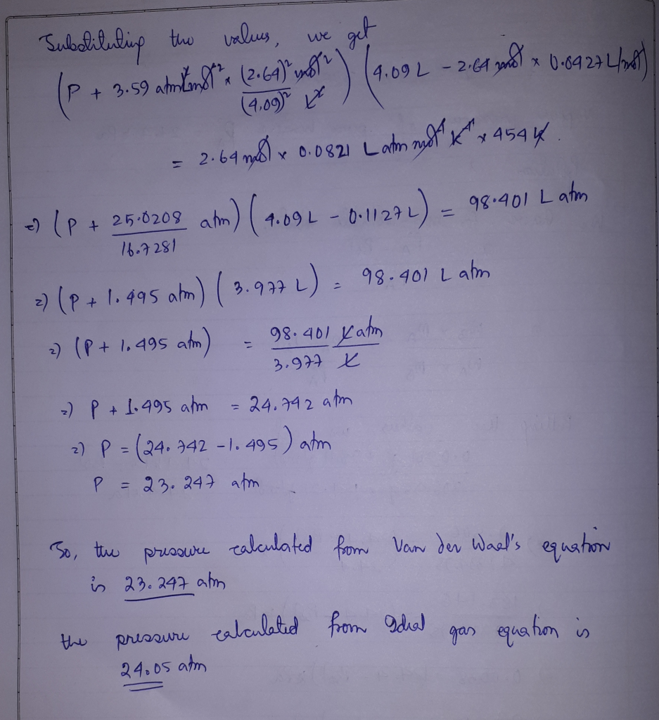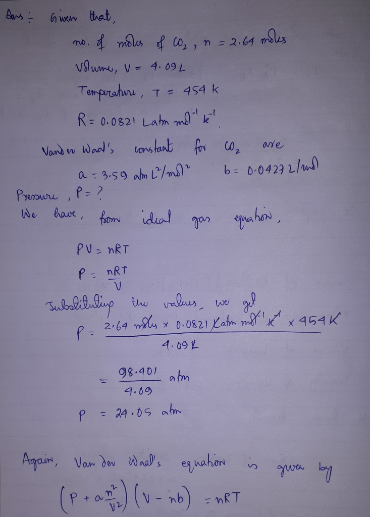 Calculate the pressure exerted by 2.64 moles of CO2 confined in a volume of 4.09 L at 454 K. What pressure is predicted by the ideal gas equation? The van der Waals constants for CO2 are a = 3.59 atm · L2/mol2 and b = 0.0427 L/mol.