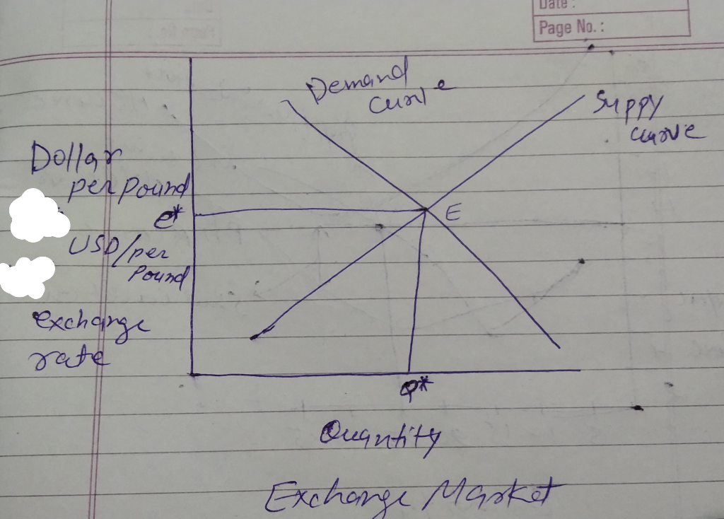 C).if any given exchange rate their is shortage of pound in exchange market.in this situation ,people start willing to pay more for foreign pound ,which increase exchange rate and by that there is contraction in demand of exchange rate and expansion of supply of exchange rate and by that gap between demand and supply decrease and shortage falls and this process keep continue till there is no shortage in the market and market reach at EQUILIBRIUM at demand =suply. Of foreign currency.