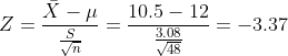 The processing time for the shipping of packages for a company, during the holidays, were recorded for 48 different orders. The mean of the 48 orders is 10.5 days and the standard deviation is 3.08 days. Raw data is given below. Use a 0.05 significance level to test the claim that the mean package processing time is less than 12.0 days. Is the company justified in stating that package processing is completed in under 12 days?