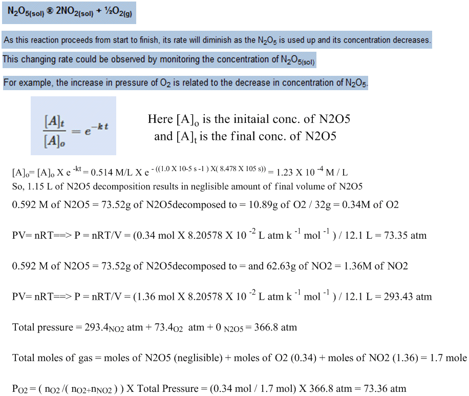 Calculate the partial pressure, in atm, of O2 produced from 1.15 L of 0.592 M N2O5 solution at 45 ∘C over a period of 24.3 h if the gas is collected in a 12.1-L container. (Assume that the products do not dissolve in chloroform.)