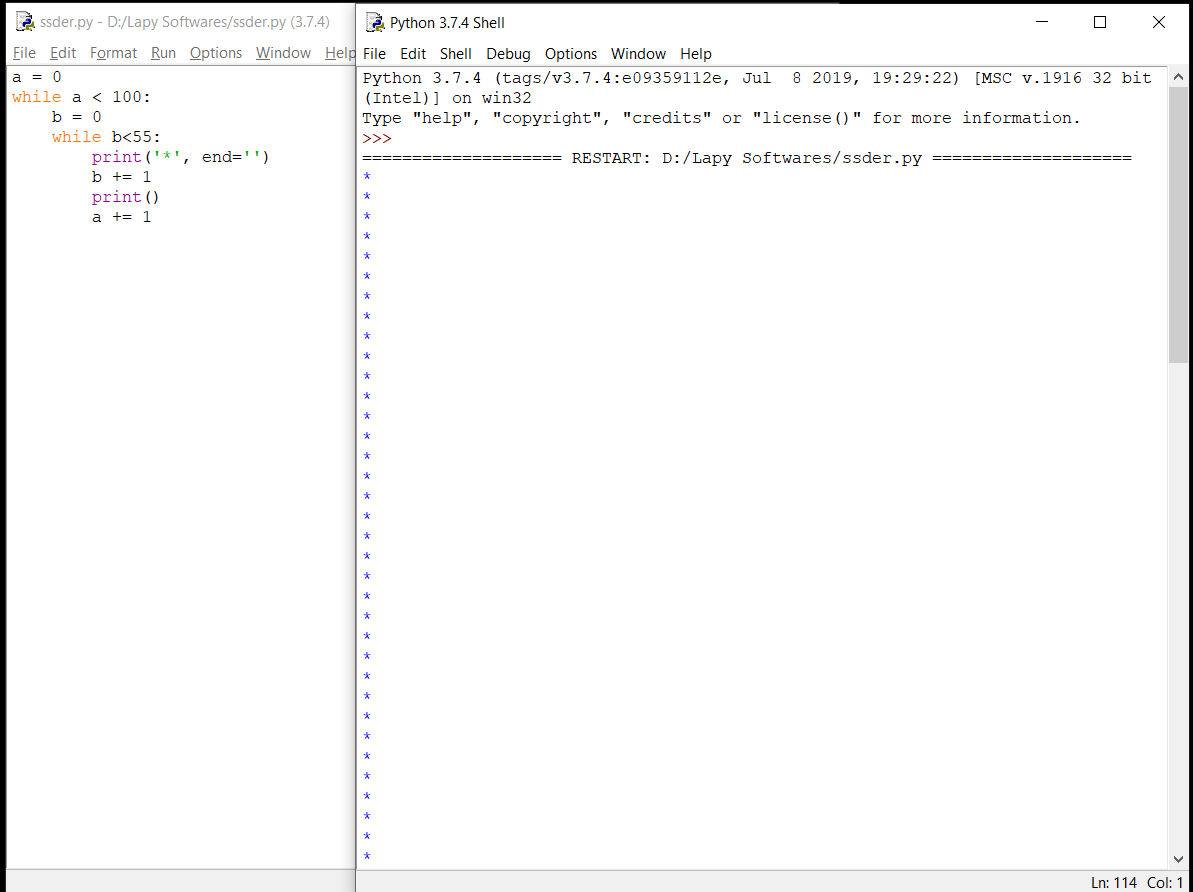 So a value will get incremented in the inner loop and it reaches 110 and B variable reaches 55. So now both condition of loop fails and the program will end. So because of two loops, the number of asterisks print is 110 as loop iterates for 110 times and prints the 100 astrisks.