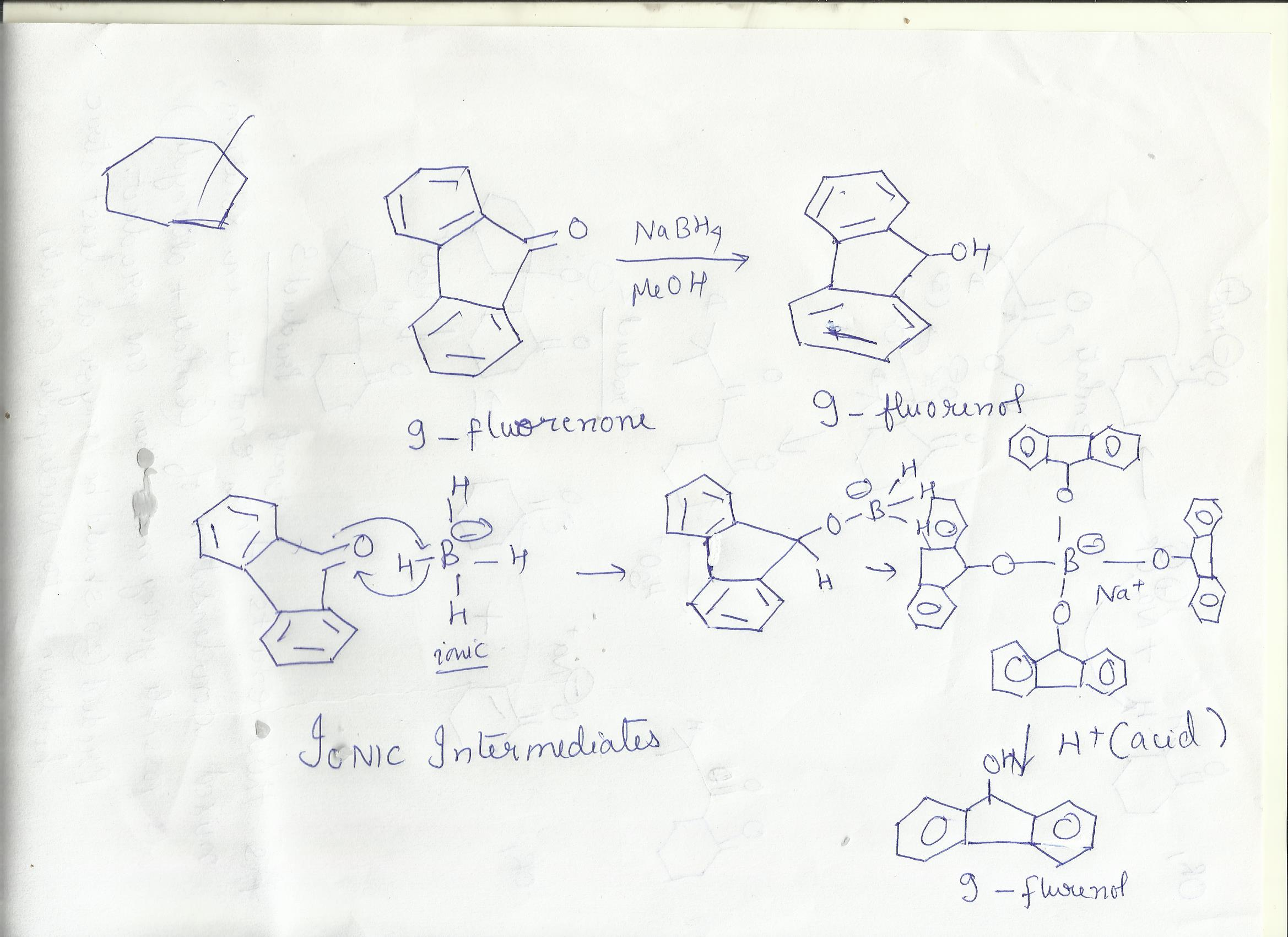 Moreover , the solubility of 9-fluorenone and 9-fluorenol is very high in methanol , a polar protic solvent.It can form hydrogen bonding with the -OH and polar -C=O groups in reactant and product.