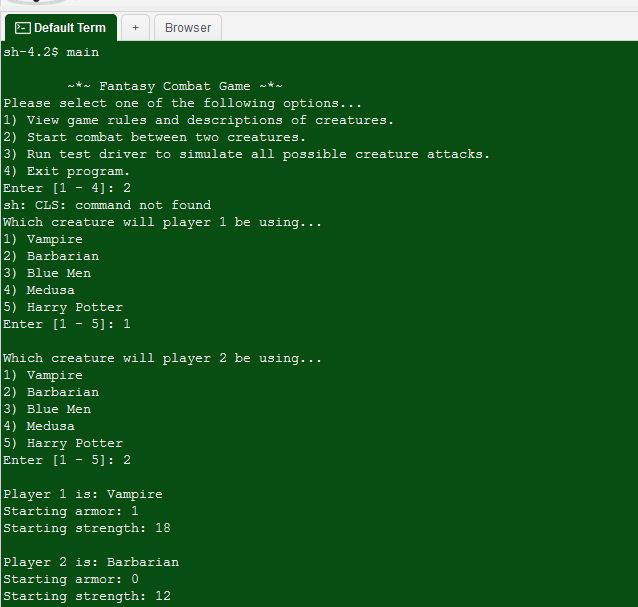 To play the game, write a menu. Display two fighters by their names and prompt the user to select two fighters to fight one another. Students must account for two fighters of the same type. Randomly select one fighter to attack first. The fighters will take turns fighting each other until one's Strength point is zero or negative. (You do not have to display results of each round of fighting, but you can do that for the purpose of debugging.) Then display the winning fighter to the screen. Ask users to play again or exit the game. This is the first stage of a larger project. Please do not add any creatures of your own.