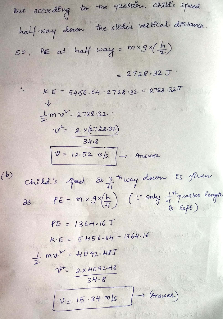 (a) What is the child's speed halfway down the slide's vertical distance?