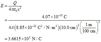 Rounding off to three significant figures, the electric field a distance 10.0 cm from the center of the thin spherical shell is 3.66 x 102 N/C.