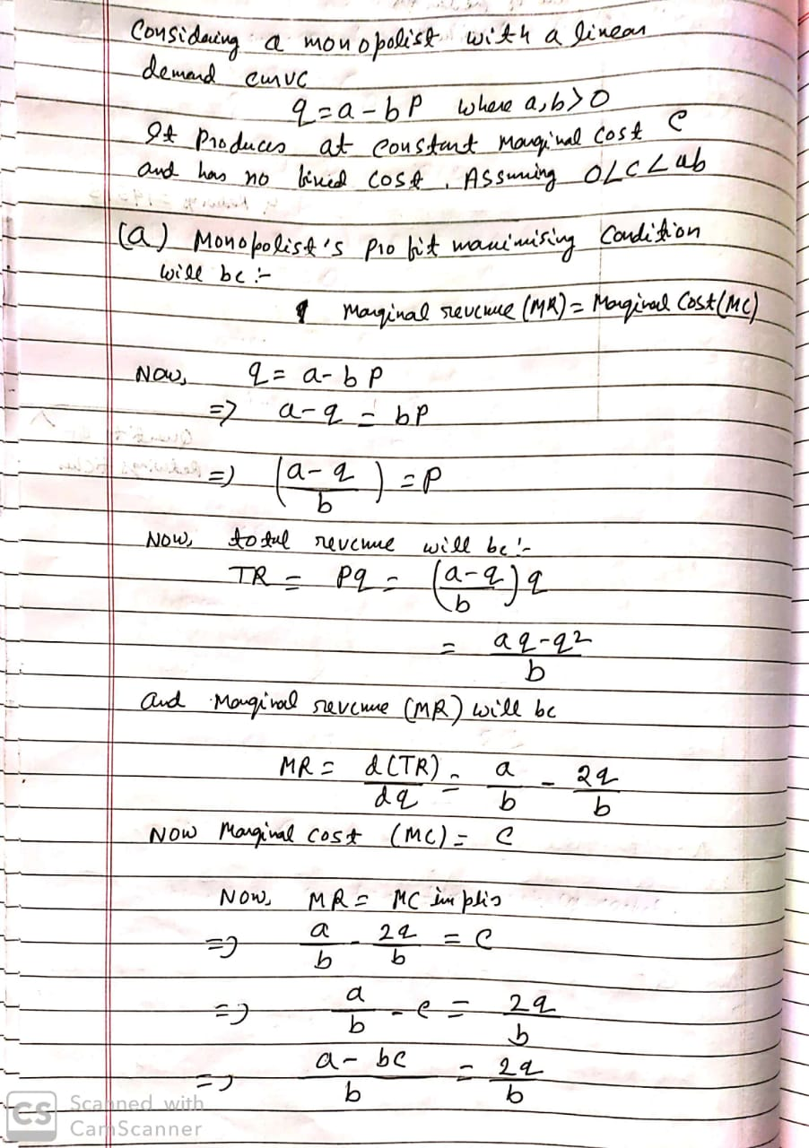 (a) Find the monopoly price, quantity, and profits. (b) Derive the