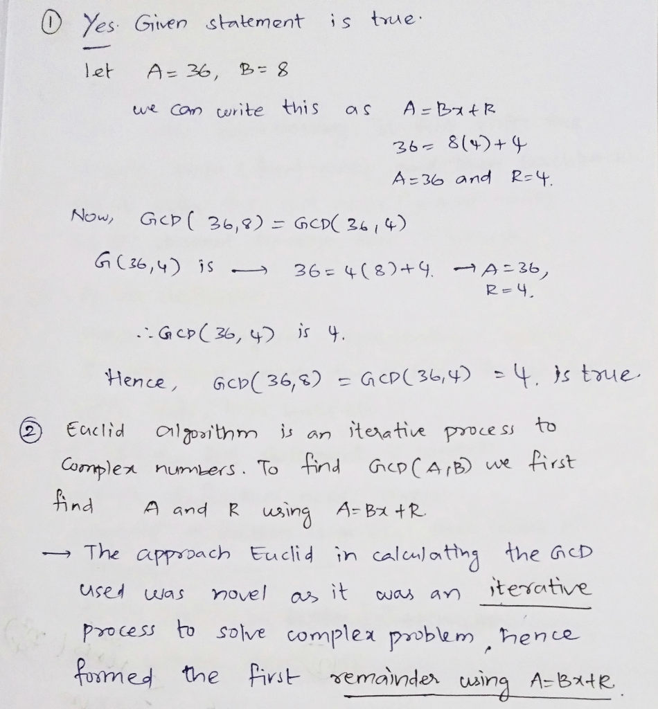 The GCD is the greatest common denominator. Euclid found that if A=Bx +R then GCD(A,B)=GCD(A,R). Prove this is true. Show working