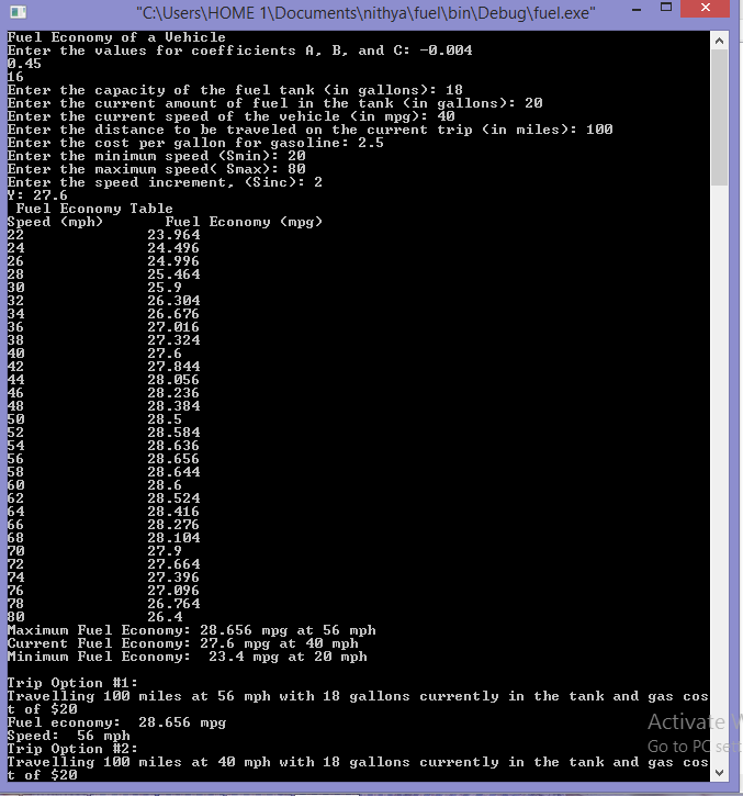 PrintTable(Smin, Smax, Sinc A, B, C) – This function will print a table of Speed (in mpg) and Fuel Economy (in mpg).