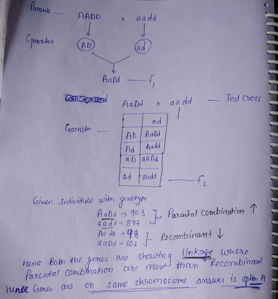 AA DD individuals were crossed to aa dd individuals. The F1 generation was then testcrossed to aa dd individuals. The resulting individuals had the following genotypes: 903 individuals with the genotype Aa Dd, 897 individuals with the genotype aa dd, 98 individuals with the genotype Aa dd, 102 individuals with the genotype aa Dd.