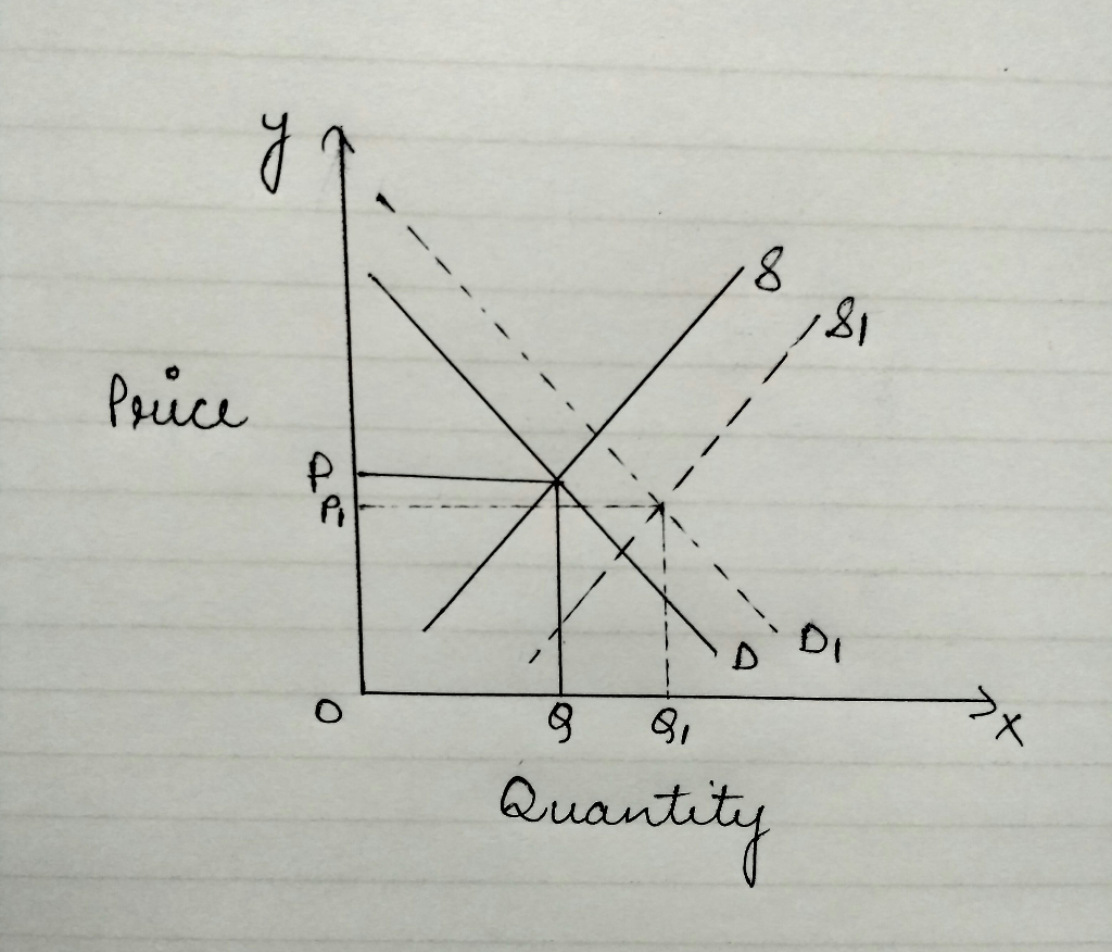 Here, the supply curve shifted forward from S to S1 and the demand curve shifted forward from D to D1. This lead to a change in the equilibrium and the equilibrium price changed from P to P1 (decreased) and the equilibrium quantity changed from Q to Q1 (increased).