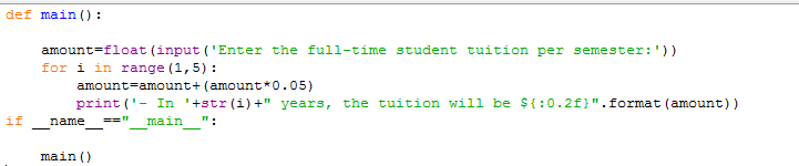 College is an investment. Tuition can range from $3,000 to $20,000 for a full-time student per semester. It seems like every year the cost continues to increase. It has been announced that the average tuition will increase by 5 percent each year for the next 4 years. To help students manage the cost of college, write a program that allows the students to input their full-time tuition cost per semester and then using a loop displays the projected semester tuition amount for the next 4 years.