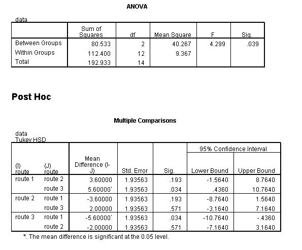 | Route 3 - Route 1 | -5.6 | -10.764 | -0.436 | 0.034 | SIGNIFICANT |