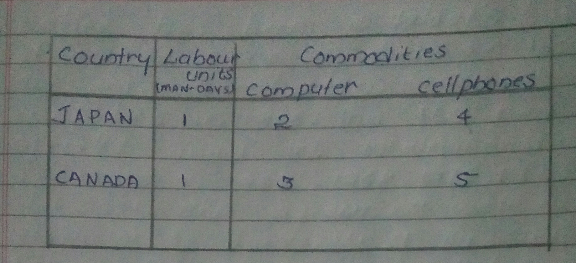 1. In Japan each unit of labor can produce 2 computers or 4 cell phones. In Canada each unit of labor can produce 3 computers or 5 cellphones.