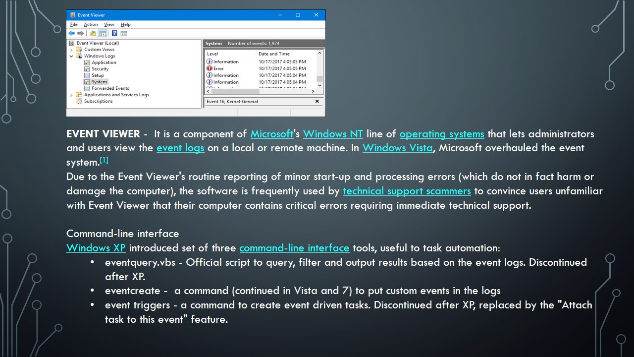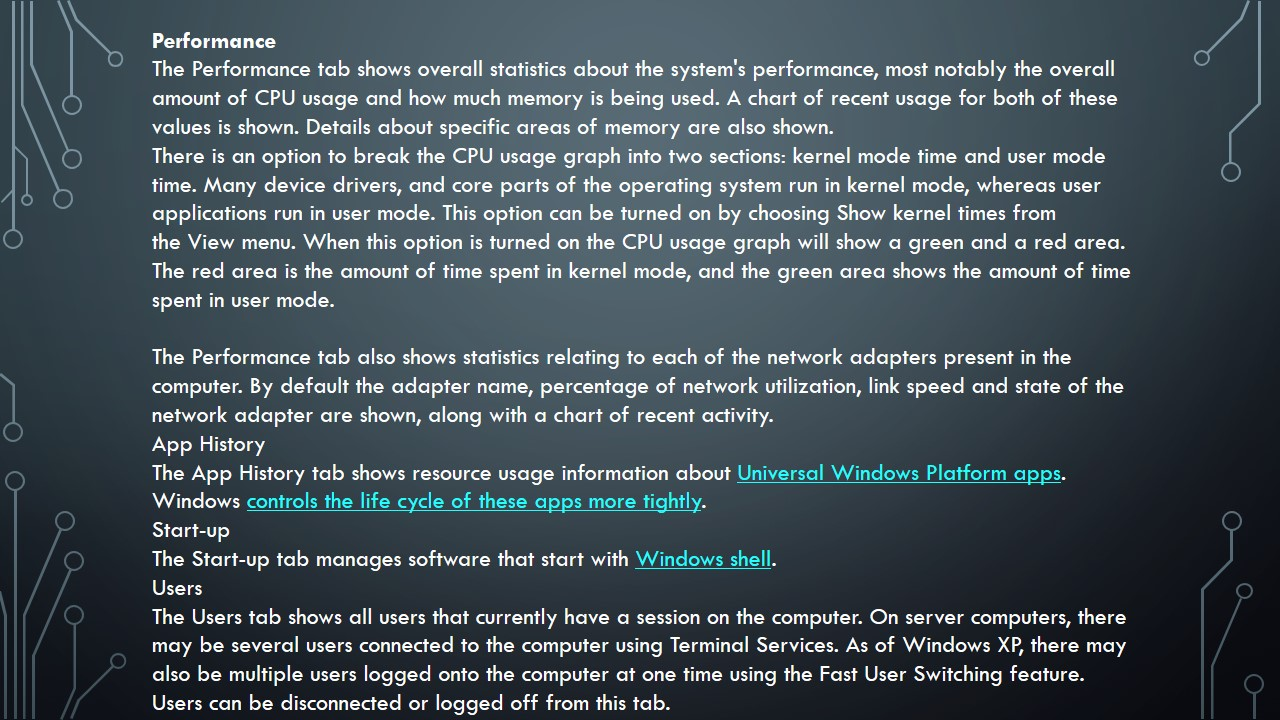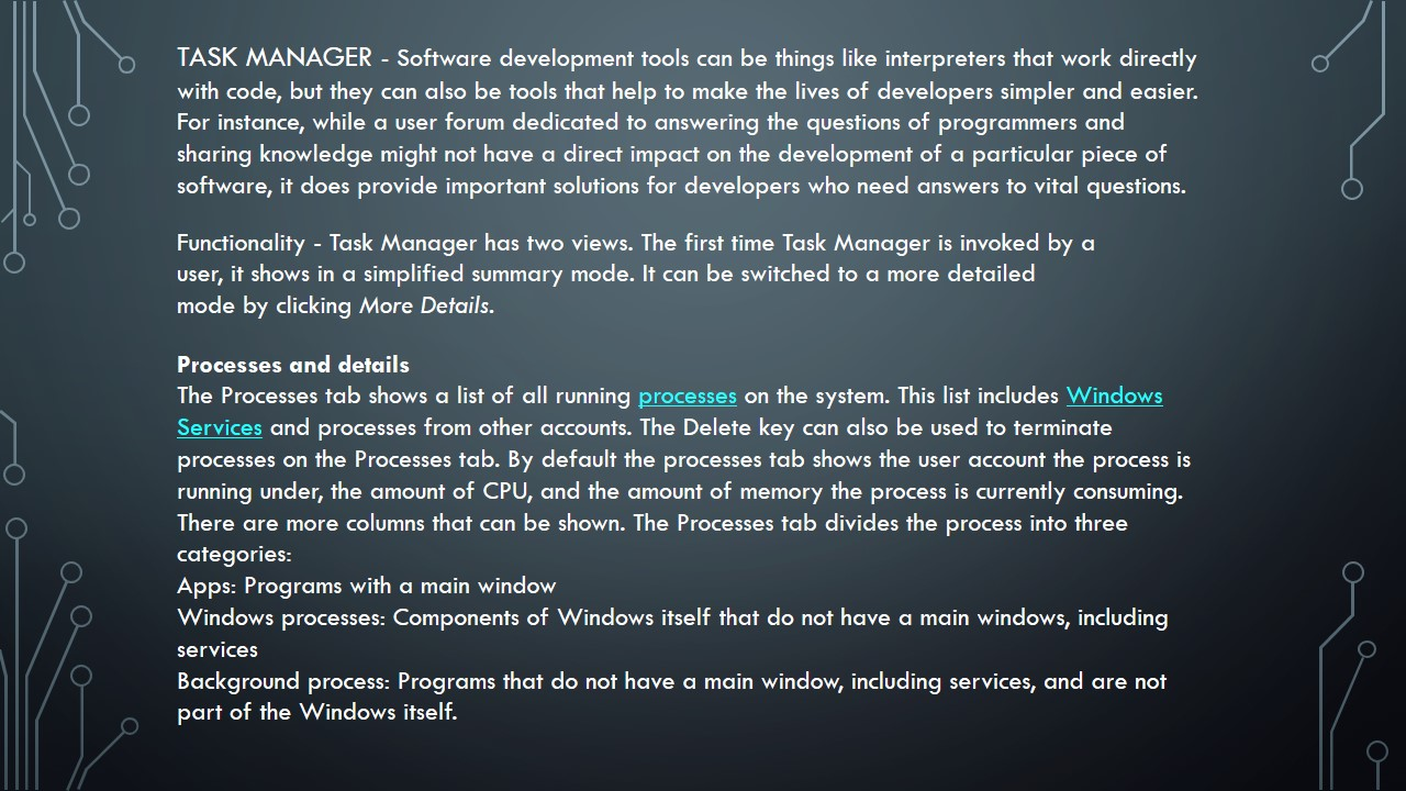 Windows monitoring tools are essential to the Windows Systems Administrator. Three software tools that are essential are: Task Manager, Event Viewer and Resource Monitor. Create a short PPT presentation of at least six slides (or more) for a 15-minute Windows Administrators Lunch and Learn session on the use of these three tools using the following requirements: