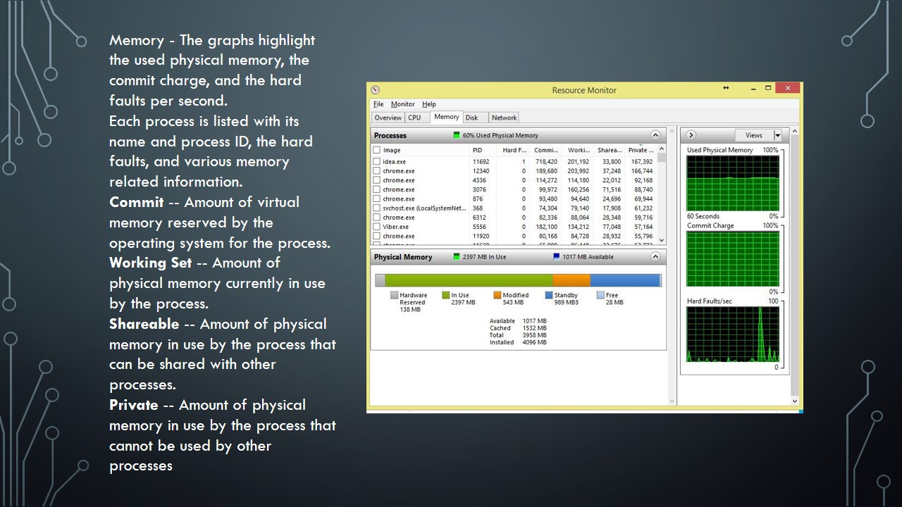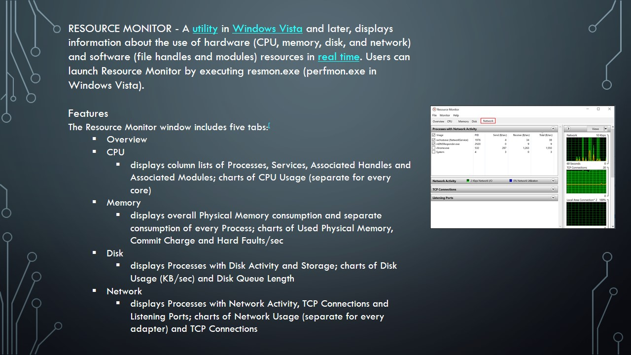 4) Discuss the four elements of Resource Monitor – CPU, Disk, Network and Memory and how it can be used in real time and to review historical logs.