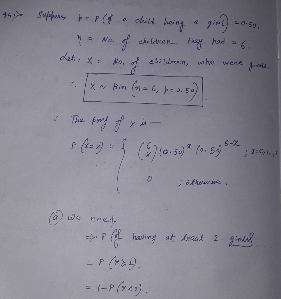 q4. The Jones family was one of the first to come to the U.S. They had 6 children. Assuming that the probability of a child being a girl is .5, find the probability that the Jones family had: at least 2 girls? at most 2 girls?