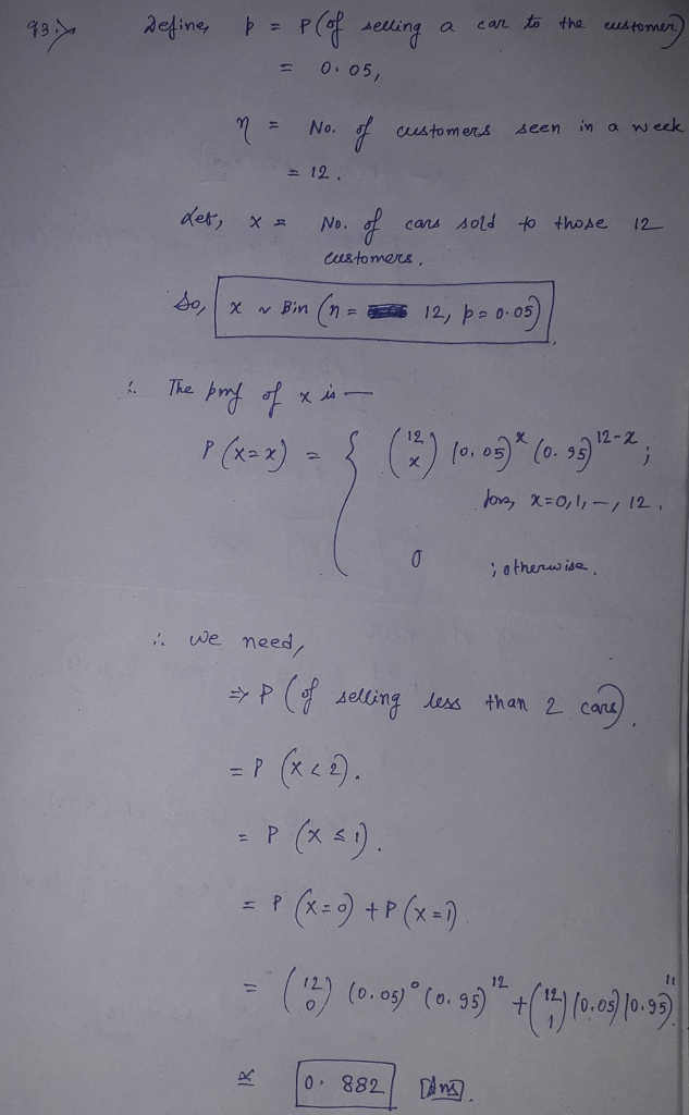 q3. The probability a car salesman sells a car to a customer is 0.05 Assuming the salesmen sees 12 customers in a week, what is the probability he sells less than 2 cars? Write answer using three decimal places