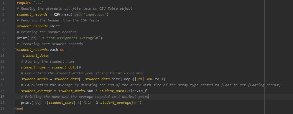 In your Ruby environment, the program must read an input file formatted in CSV format, named input.csv. Each record contains data about a student and their corresponding grades.
