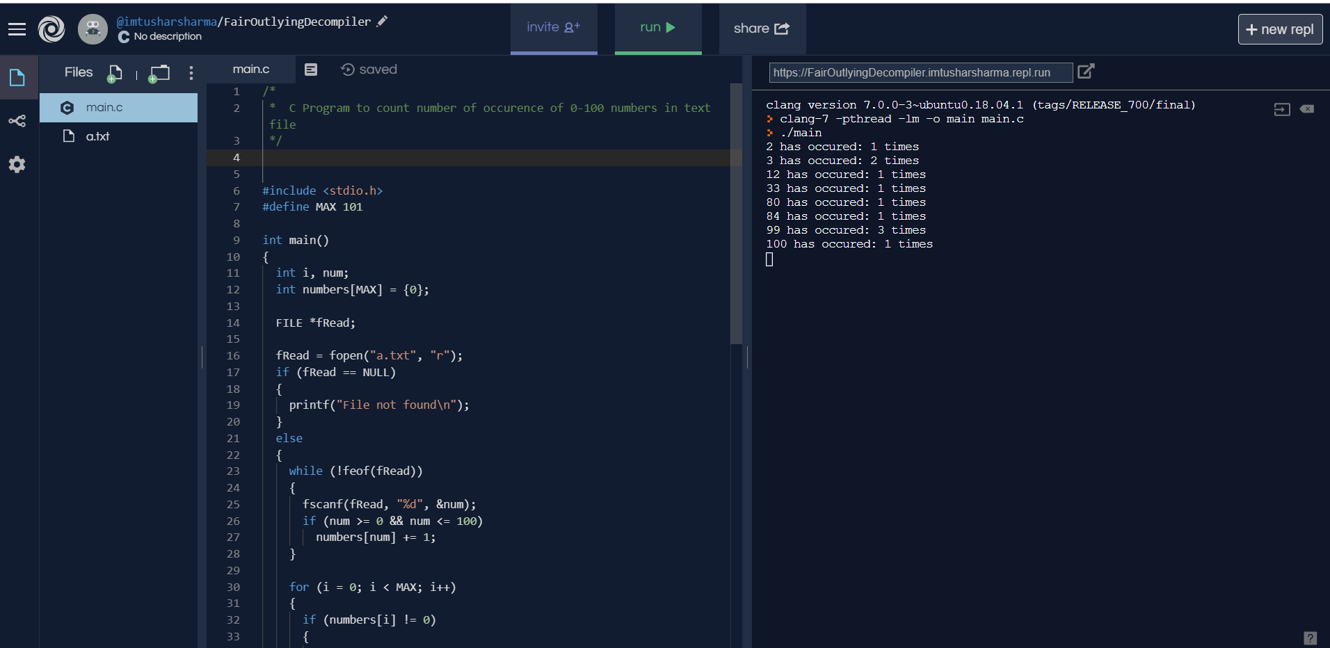 Write a program IN C that reads all integers that are in the range of 0 to 100, inclusive from an input file named: a.txt and counts how many occurrences of each are in the file. After all input has been processed, display all the values with the number of occurrences that were in are in the input file.