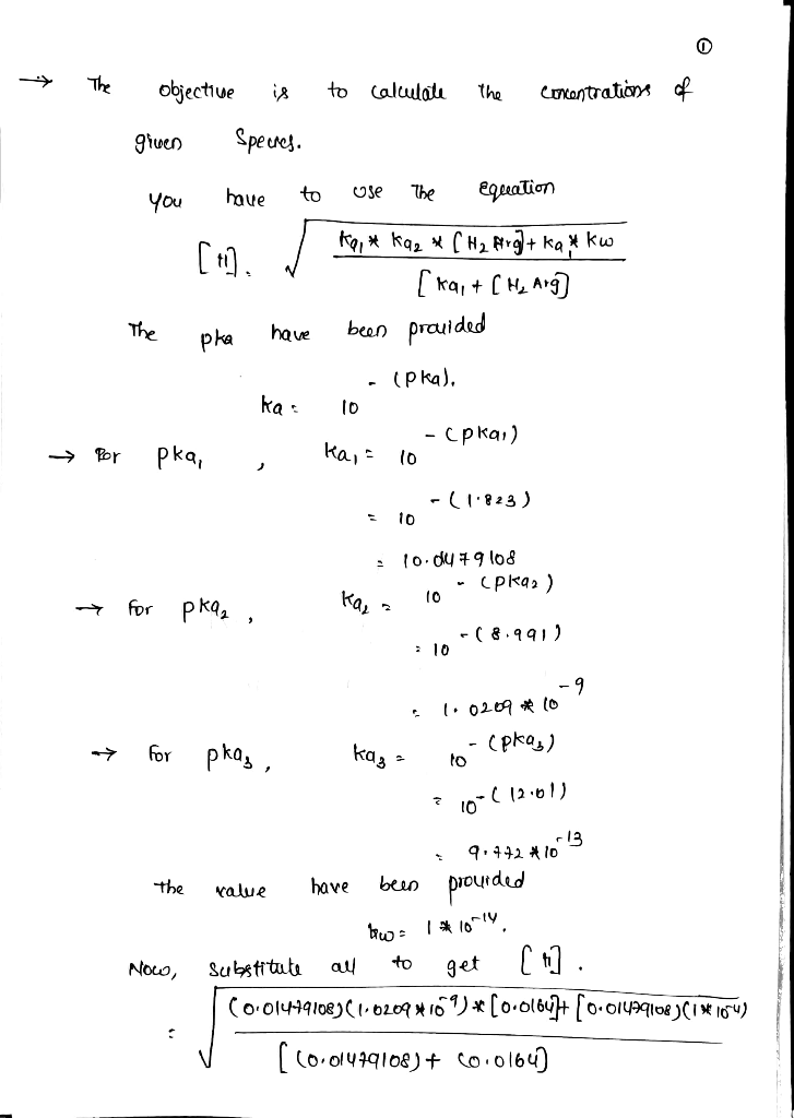 Calculate the pH of a 0.0164 M solution of arginine hydrochloride (arginine·HCl, H2Arg ). Arginine has pKa values of 1.823 (pKa1), 8.991 (pKa2), and 12.01 (pKa3).