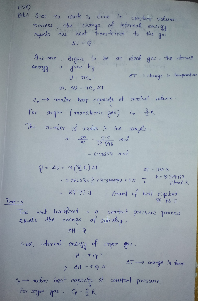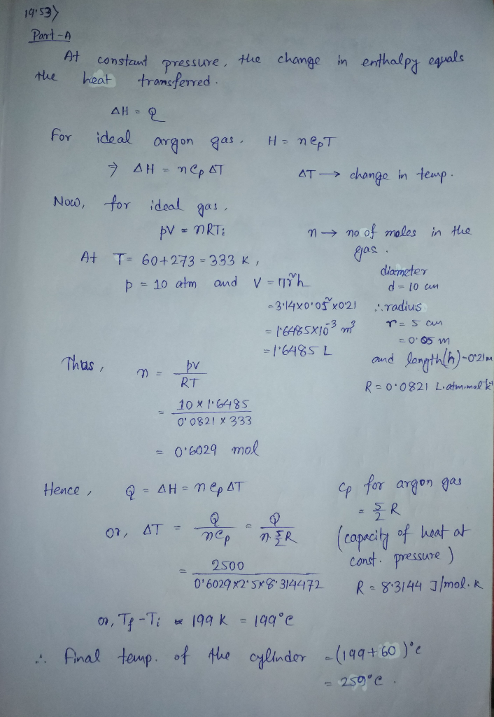 19.53 A 10 cm -diameter cylinder contains argon gas at 10 atm pressure and a temperature of 60 ∘C . A piston can slide in and out of the cylinder. The cylinder's initial length is 21 cm . 2500 J of heat are transferred to the gas, causing the gas to expand at constant pressure.
