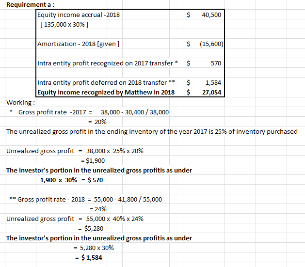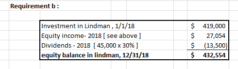 Matthew, Inc. owns 30 percent of the outstanding stock of Lindman Company and has the ability to significantly influence the investee’s operations and decision making. On January 1, 2018, the balance in the Investment in Lindman account is $419,000. Amortization associated with this acquisition is $15,600 per year. In 2018, Lindman earns an income of $135,000 and declares cash dividends of $45,000. Previously, in 2017, Lindman had sold inventory costing $30,400 to Matthew for $38,000. Matthew consumed all but 25 percent of this merchandise during 2017 and used the rest during 2018. Lindman sold additional inventory costing $41,800 to Matthew for $55,000 in 2018. Matthew did not consume 40 percent of these 2018 purchases from Lindman until 2019.