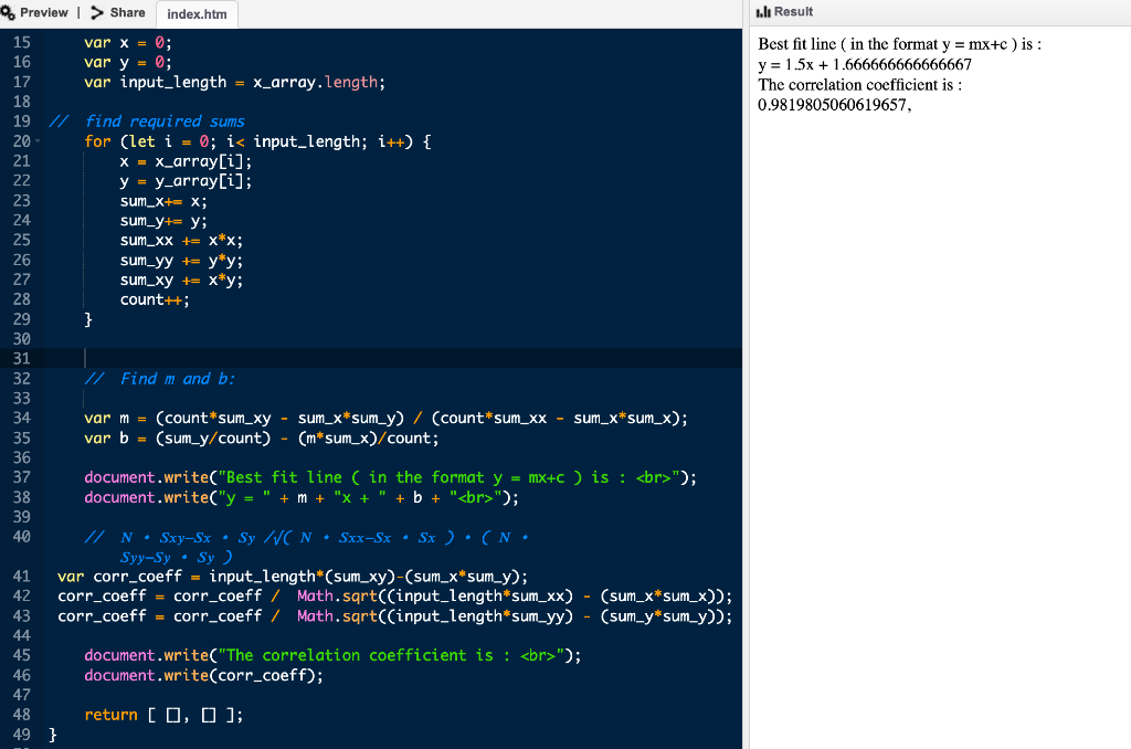document.write("y = " + m + "x + " + b +