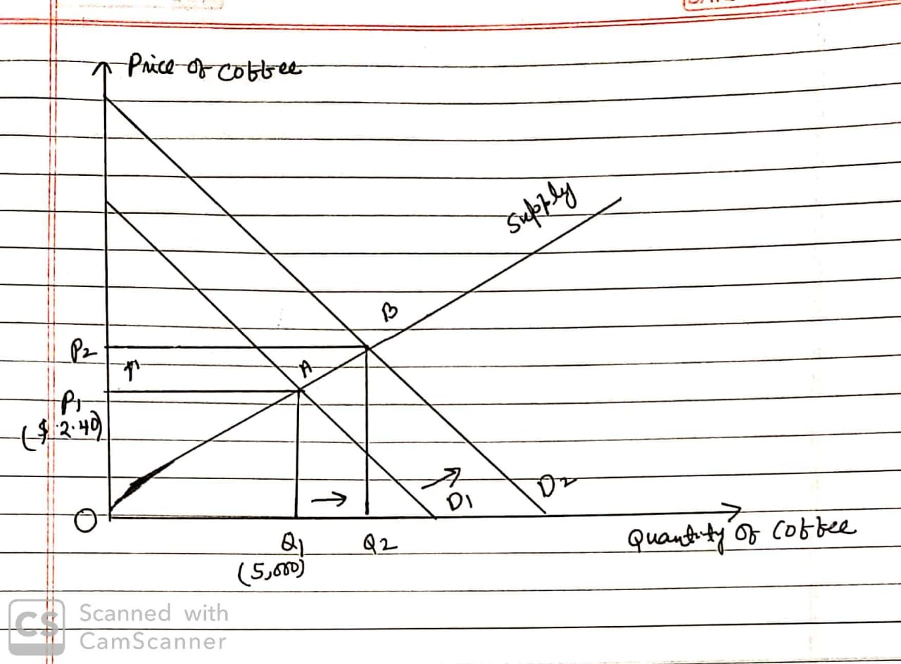 Answer: We start by assuming that the market for coffee operates at an equilibrium price of $2.40 and an equilibrium quantity of 5000. Now as tea and coffee are perfect substitutes, an increase in the price of tea will increase the demand for coffee as consumers will switch to coffee consumption because of higher price of tea. As a result of this higher demand, the demand curve for coffee will shift rightward from D1 to D2 and as the economy moves from point A to point B, the equilibrium price of coffee rises from $2.40 to P2 and the equilibrium quantity of coffee increases from 5000 to Q2.
