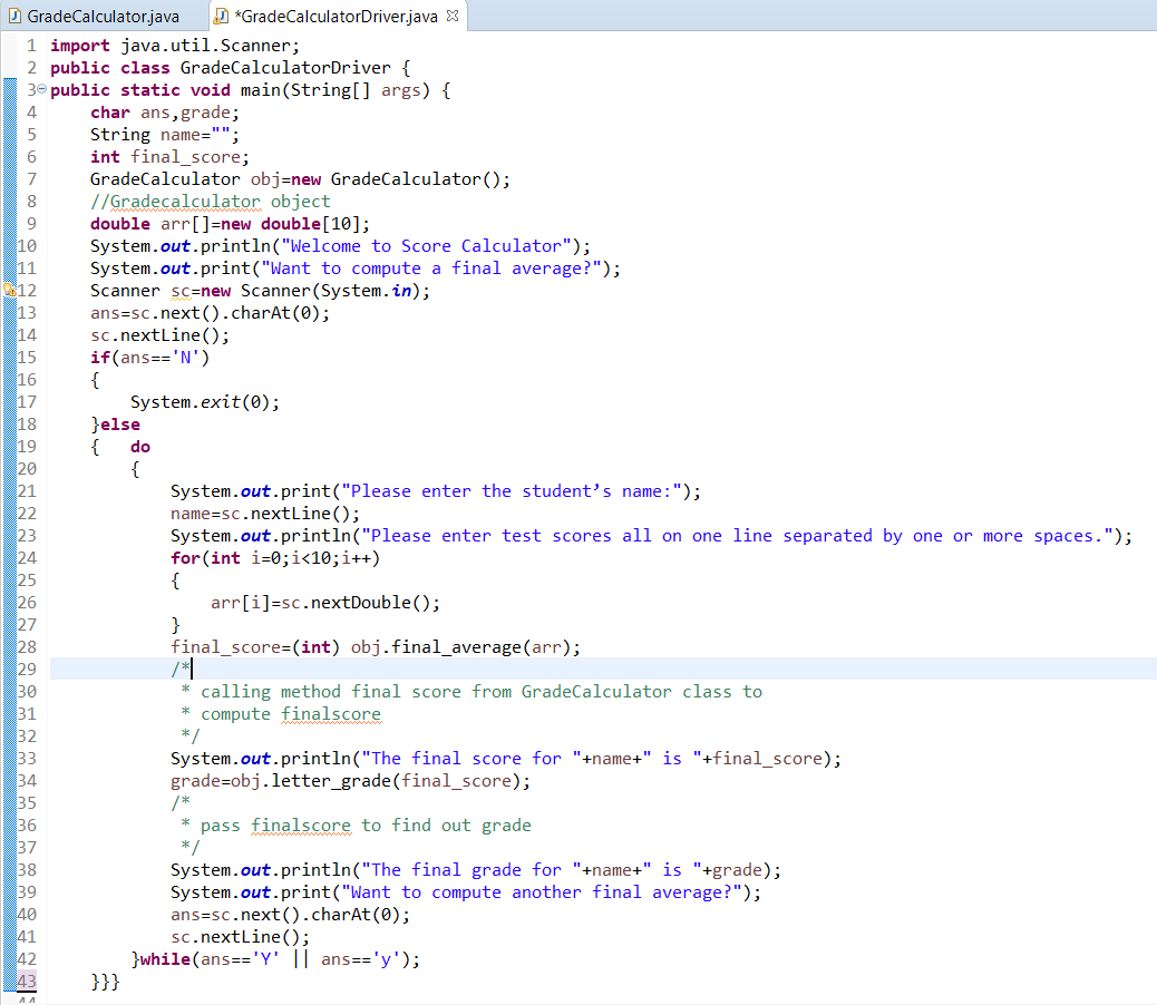 In the GradeCalculatorDriver class, include a main method that asks the user for the student’s name and their ten exam grades, reads the grades, calculates the letter grade and prints it. This process should be repeated until the user enters N.