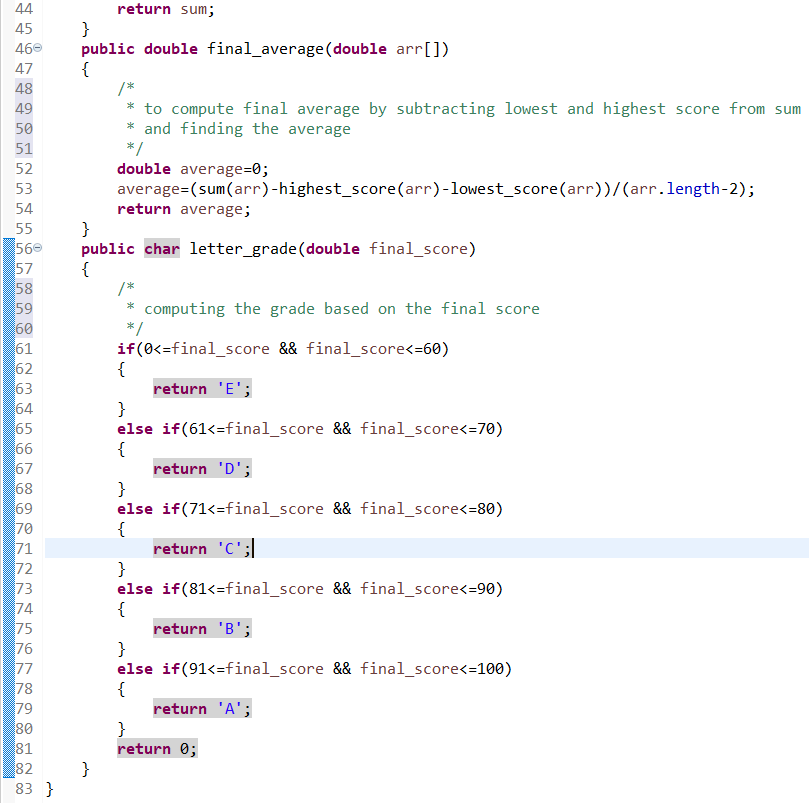 In the GradeCalculator class, compute the final average and letter grade for a particular student.