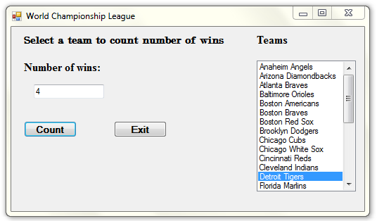 Hint: Read the contents of the WorldSeriesWinners.text file into a List. When the user selects a team in the ListBox, the application should display the number of times the selected team appears.